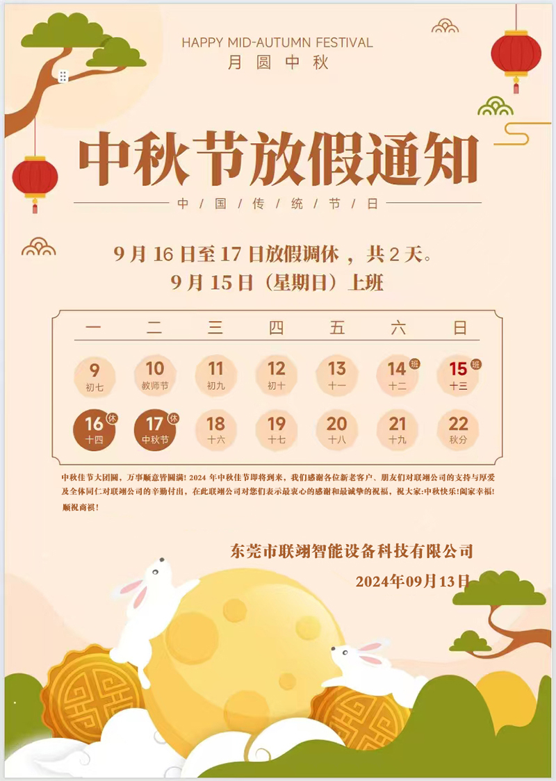中秋佳節(jié)大團圓,萬事順意皆圓滿! 2024 年中秋佳節(jié)即將到來,我們感謝各位新老客戶、朋友們對聯翊公司的支持與厚愛及全體同仁對聯翊公司的辛勤付出,在此聯翊公司對您們表示最衷心的感謝和最誠摯的祝福,祝大家:中秋快樂!闔家幸福!